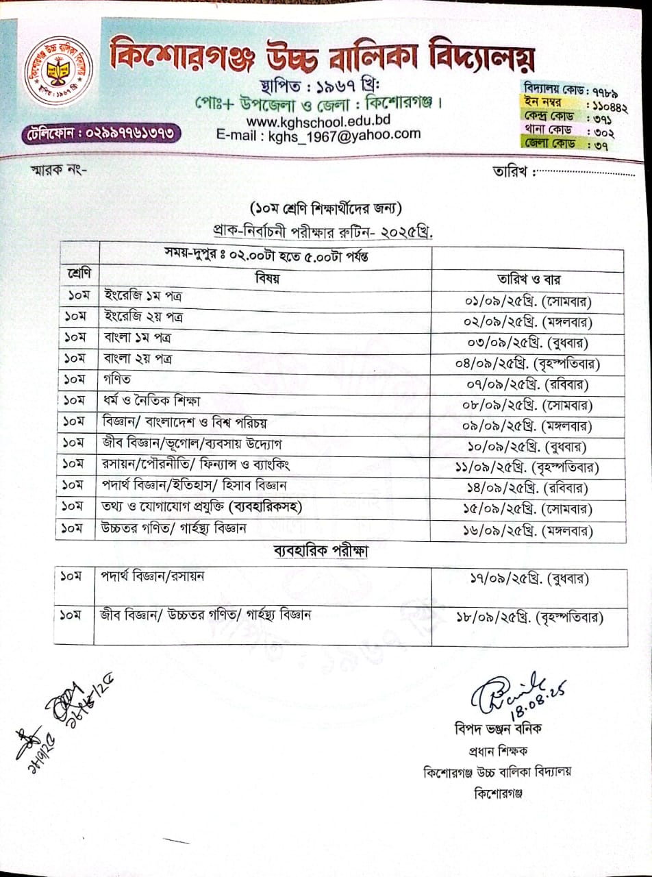 দশম শ্রেণীর পরীক্ষার্থীদের প্রাক নির্বাচনী রুটিন ২০২৫